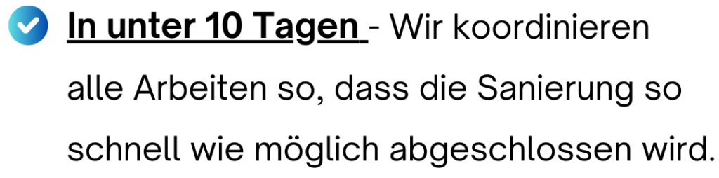 Gerade mal 10 Tage. Wir sind Profis, arbeiten zügig und planen alles genau so, dass keine Zeit verschwendet wird.